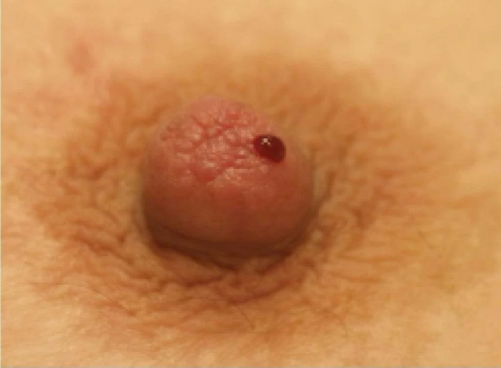 The two most common causes of pathological nipple discharge are intraductal papilloma and duct ectasia. The former is a benign growth within a milk duct associated with unilateral clear or bloody nipple discharge, while the latter is referred to dilated subareolar milk ducts associated with often bilateral greenish or cheesy discharge.