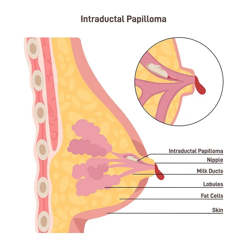 Think of these lesions as little polyps arising from the milk ducts lining. Although benign, excision is recommended as they can harbour cancer cells within them or develop into breast cancer in the long run.